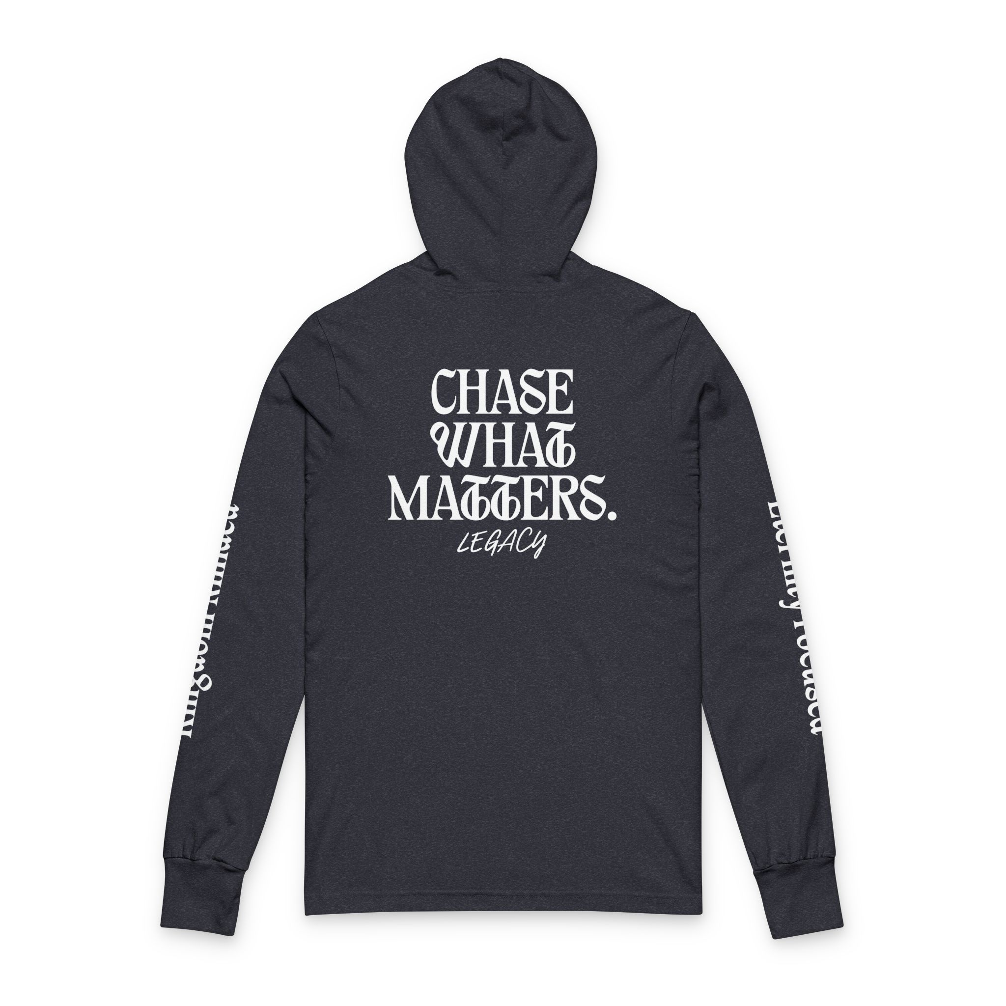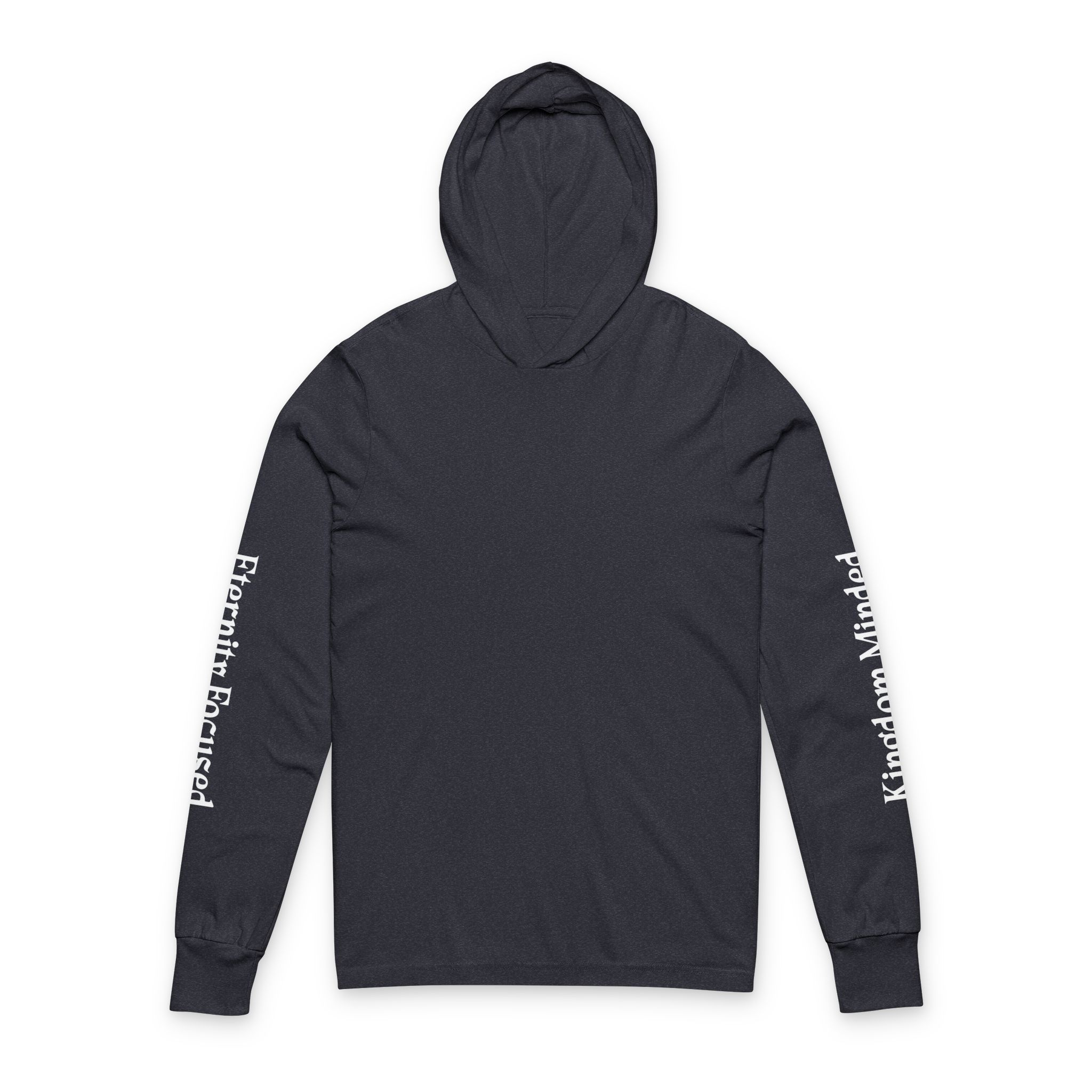 Hooded long-sleeve tee with sleeve text: “Kingdom Minded” and “Eternity Focused.”